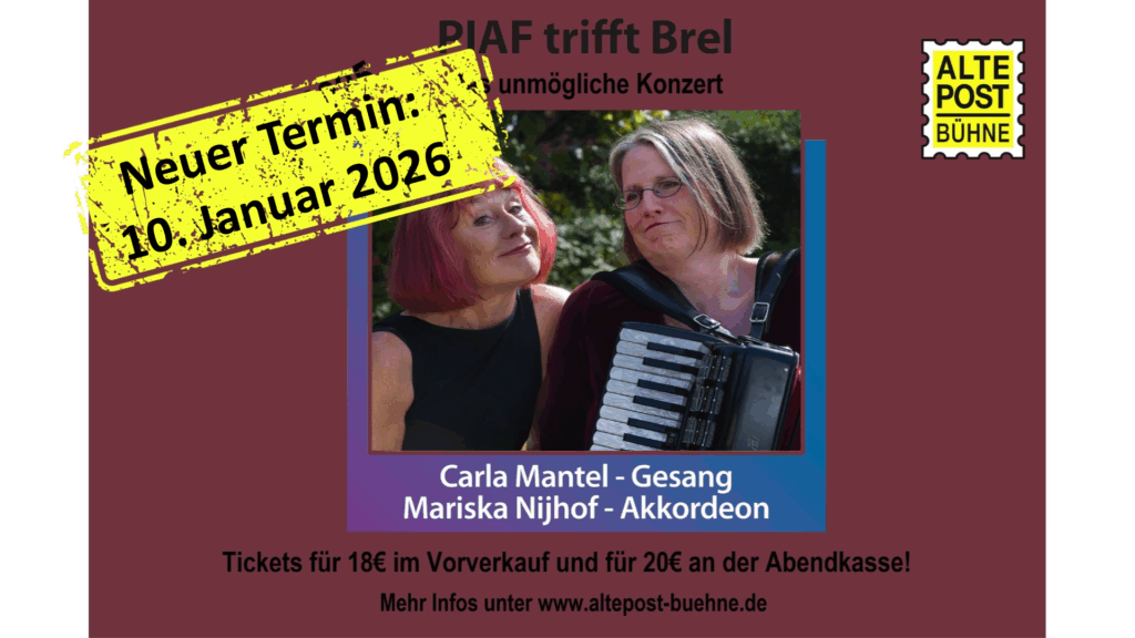 Leider müssen wir euch mitteilen, dass das Konzert “Piaf trifft Brel” verschoben werden muss, da die Künstlerin erkrankt ist, aber wir haben einen neuen Termin und ihr müsst gar nicht so lange darauf warten: Am 10. Januar 2026 um 19:30 Uhr heißt es dann “Das unmögliche Konzert – Piaf trifft Brel!”